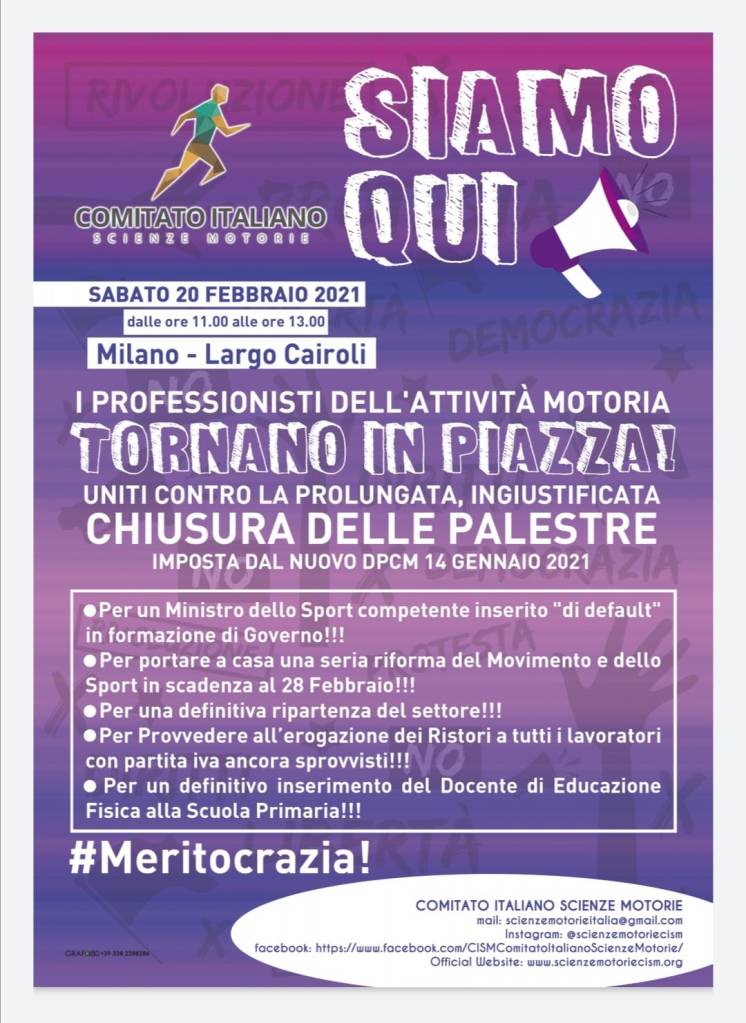 Sabato 20 febbraio 2021 in tutte le piazze d’Italia ci sarà una manifestazione per protestare contro la chiusura delle palestre, soprattutto quelle dedicate alla salute delle persone.